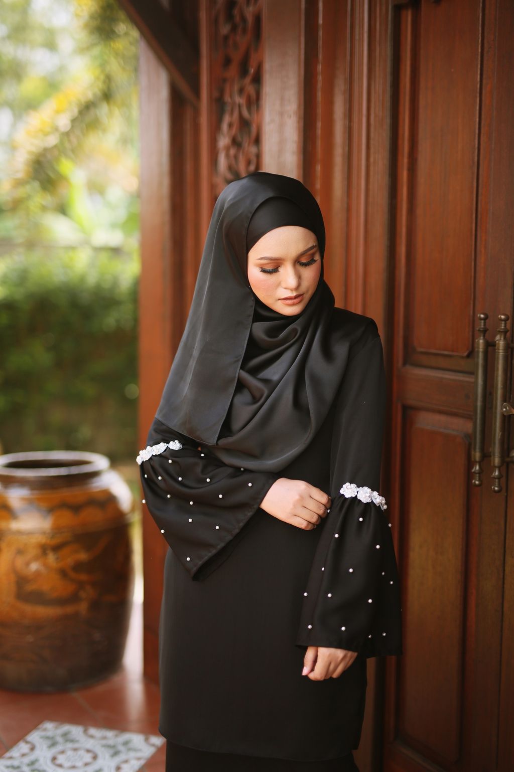 Kurung Manja is beautiful with sprinkles of pearls sewn on the sleeves. This is accentuated by adding 3D flowers, setting this baju kurung design apart from other hari raya collections. The wearers look so gorgeous especially when mother and daughter are walking hand in hand to visit relatives.