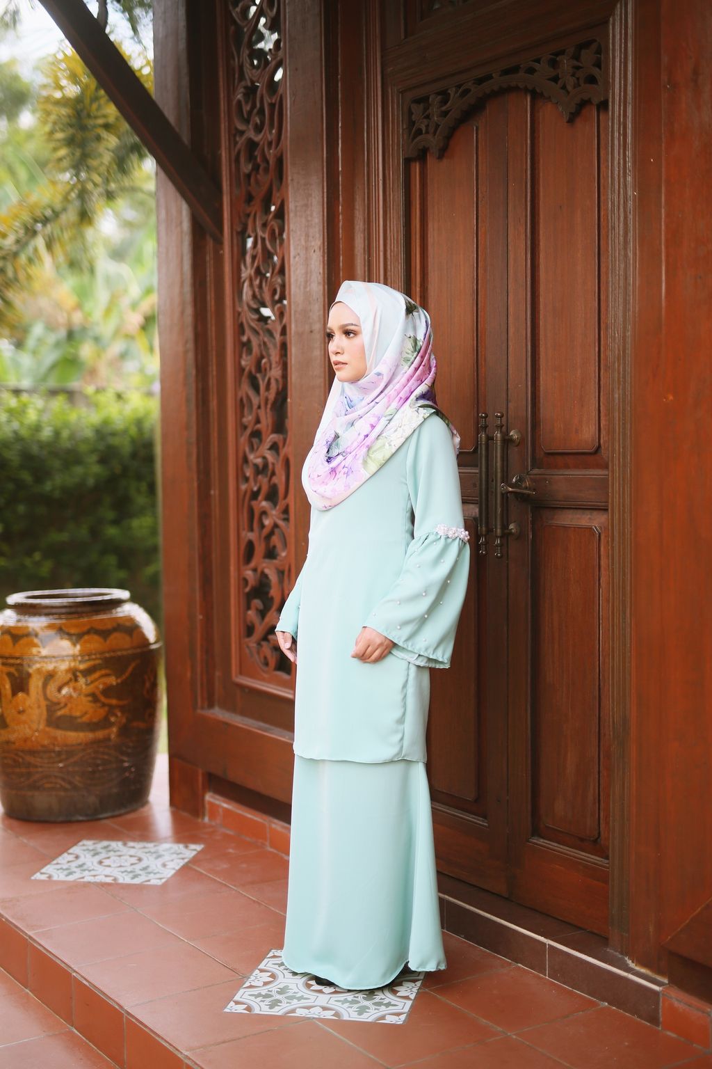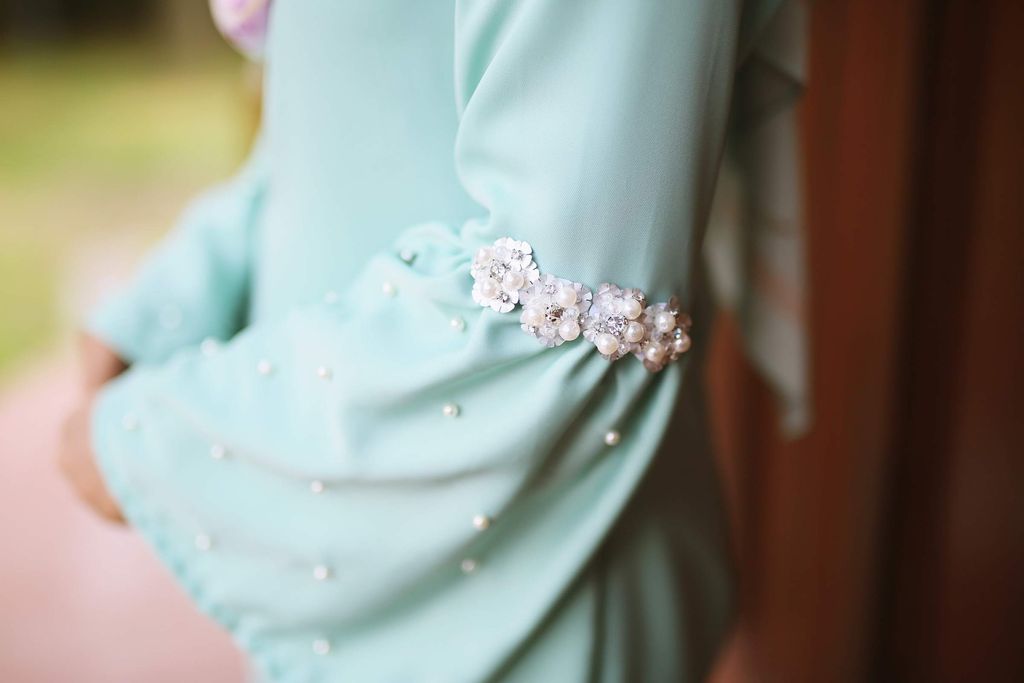 Kurung Manja is beautiful with sprinkles of pearls sewn on the sleeves. This is accentuated by adding 3D flowers, setting this baju kurung design apart from other hari raya collections. The wearers look so gorgeous especially when mother and daughter are walking hand in hand to visit relatives.