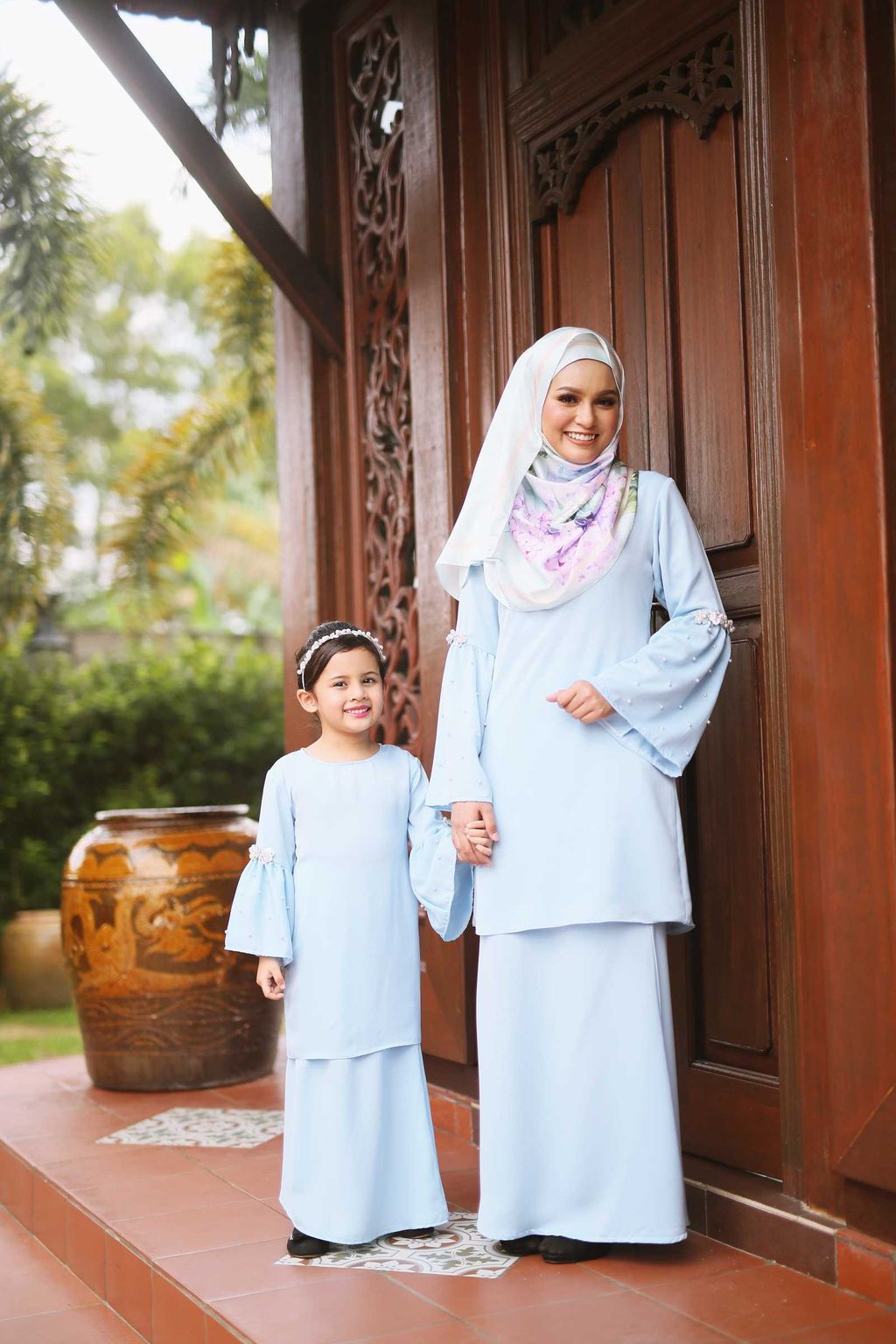 Kurung Manja is beautiful with sprinkles of pearls sewn on the sleeves. This is accentuated by adding 3D flowers, setting this baju kurung design apart from other hari raya collections. The wearers look so gorgeous especially when mother and daughter are walking hand in hand to visit relatives.
